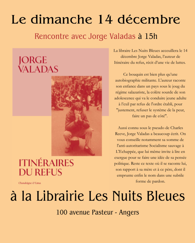 Nous avons l’honneur d’accueillir à la librairie l’auteur et baroudeur Jorge Valadas pour son dernier livre Itinéraire du refus, un livre plein de vivacité des souvenirs de coup de foudre et de coup d’éclat d’une époque pas si lointaine que peu connaisse et qui pourtant fait echo à l’actuel. Un Portugal sous Salazar, l’armer et les rêve militant de nouvelle contré, le mal du pays aussi, des amitiés partie trop vite, rendez-vous le Dimanche 14 décembre à 15h pour écouter son histoire d’un itinéraire du refus face au fascisme, face à la dictature, au silence, aux frontières,...